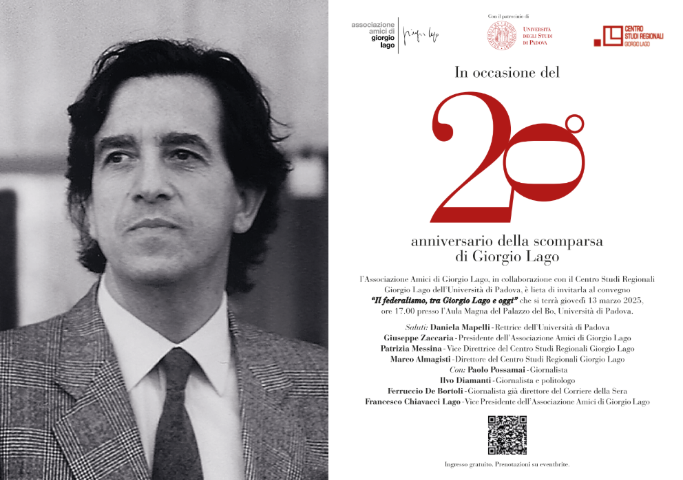In occasione del ventesimo anniversario della scomparsa del grande giornalista veneto, l’Associazione Amici di Giorgio Lago, in collaborazione con il Centro Studi Regionali Giorgio Lago, è lieta di invitarla al convegno “Il Federalismo, tra Giorgio Lago e oggi” che si terrà giovedì 13 marzo 2025. L’ evento gode del patrocinio dell’Università di Padova.