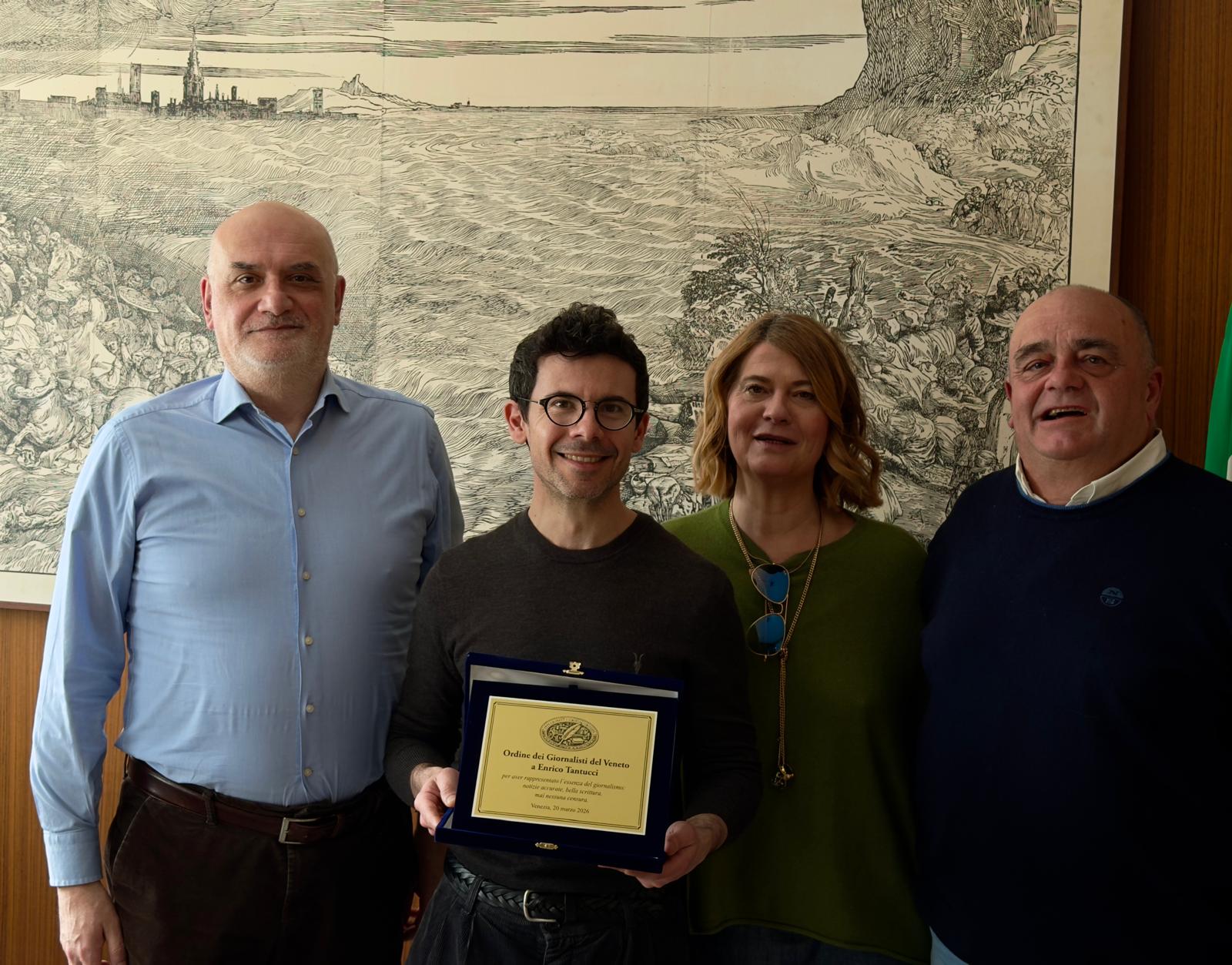 La targa è stata consegnata martedì 31 marzo dal presidente dell’Ordine, Andrea Buoso, e dai consiglieri Roberta De Rossi e Carlo Mion (colleghi di Tantucci a La Nuova Venezia e nel gruppo Nem) al figlio Vittorio, che si è detto commosso: “Questo premio per me ha un valore profondo, grazie davvero per questo riconoscimento e per continuare a ricordare mio padre non solo come persona, ma anche come giornalista di grande valore”.