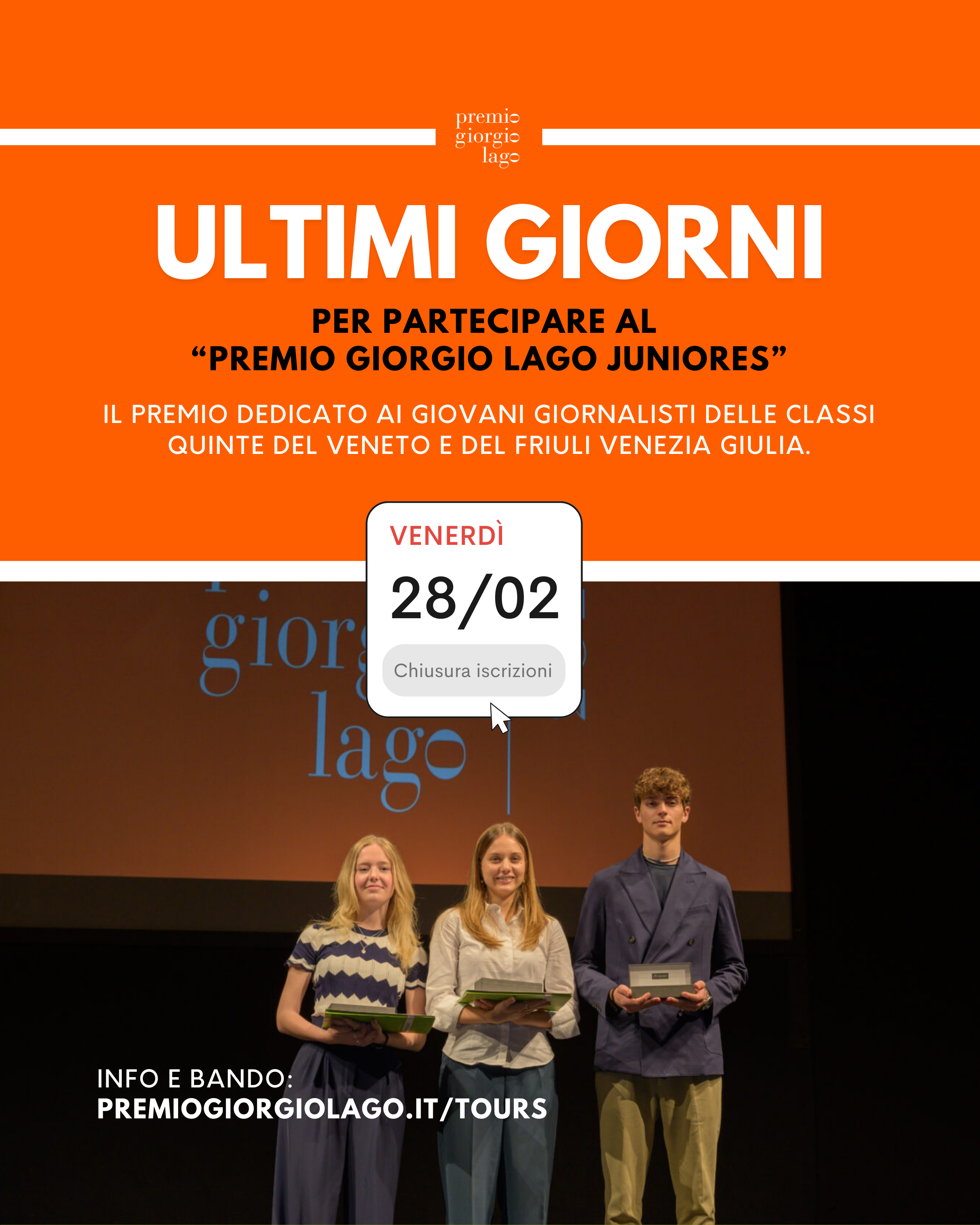C'è tempo fino al 28 febbraio per partecipare alla nuova edizione del Premio Giorgio Lago Juniores. Gli studenti dell’ultima classe degli Istituti Superiori del Veneto e del Friuli Venezia Giulia potranno partecipare scrivendo un articolo, di massimo 3000 battute, dedicato al tema “Essere o apparire: le distorsioni della società dell’immagine”. Gli elaborati dovranno essere inviati a info@premiogiorgiolago.it.