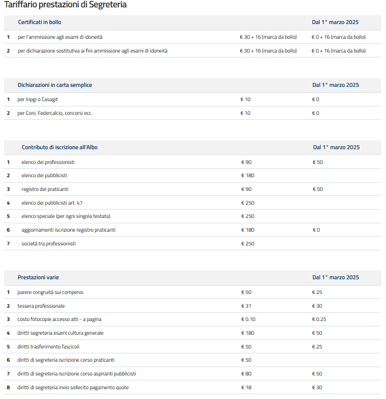 Durante l'ultima riunione, infatti, il Consiglio - alla luce del buon andamento del conto economico dell'Ordine - ha votato all'unanimità la riduzione delle tariffe per 11 prestazioni: dalle dichiarazioni per Inpgi, Casagit, Coni, Federcalcio, concorsi, ecc., ai contributi di iscrizione all'Albo, fino ai pareri di congruità sui compensi. Di contro, vengono alzati i diritti di segreteria per l'invio del sollecito del pagamento quote di iscrizione (cioè per chi non paga entro il 31 gennaio, come previsto dalla legge e non risponde al primo sollecito).